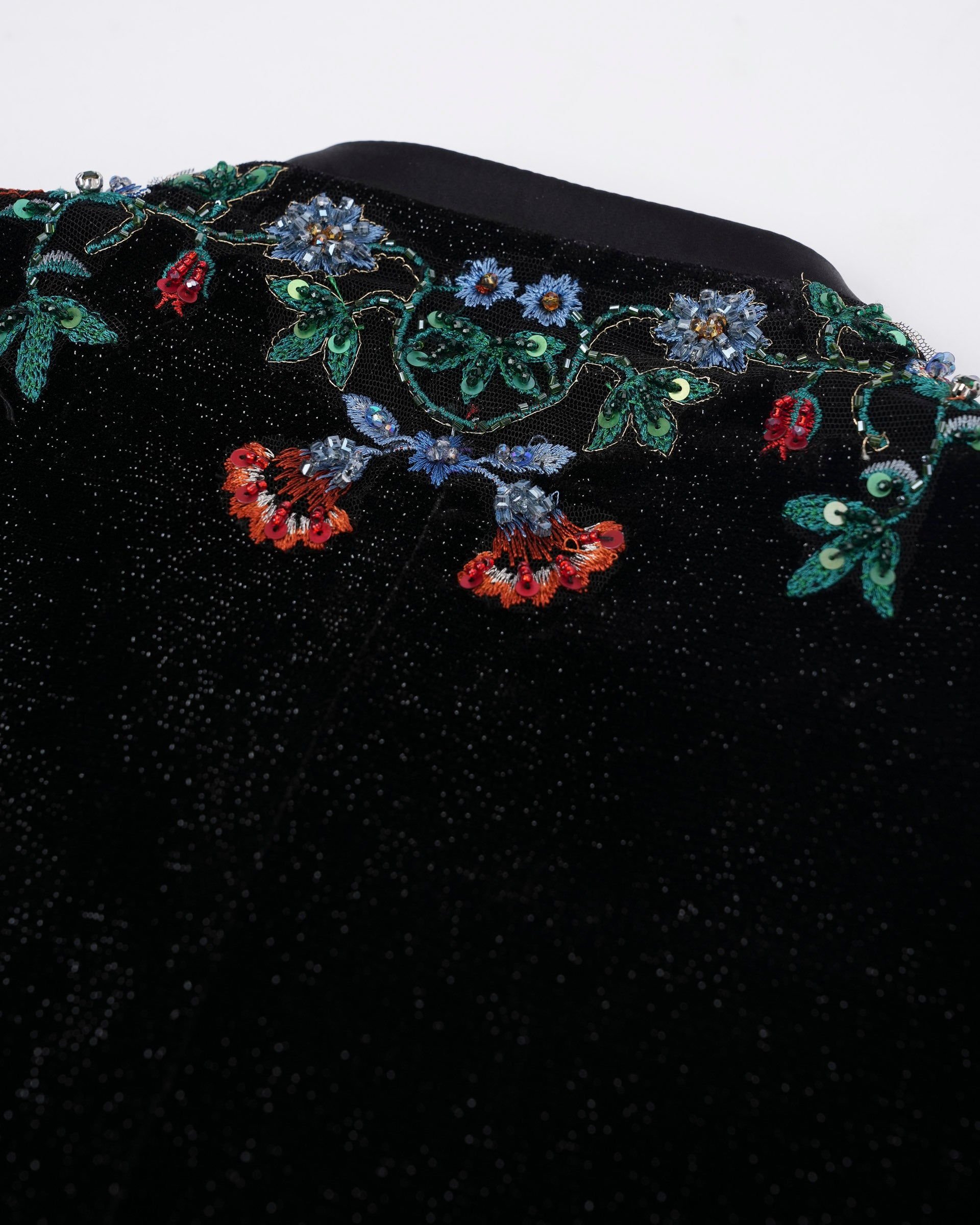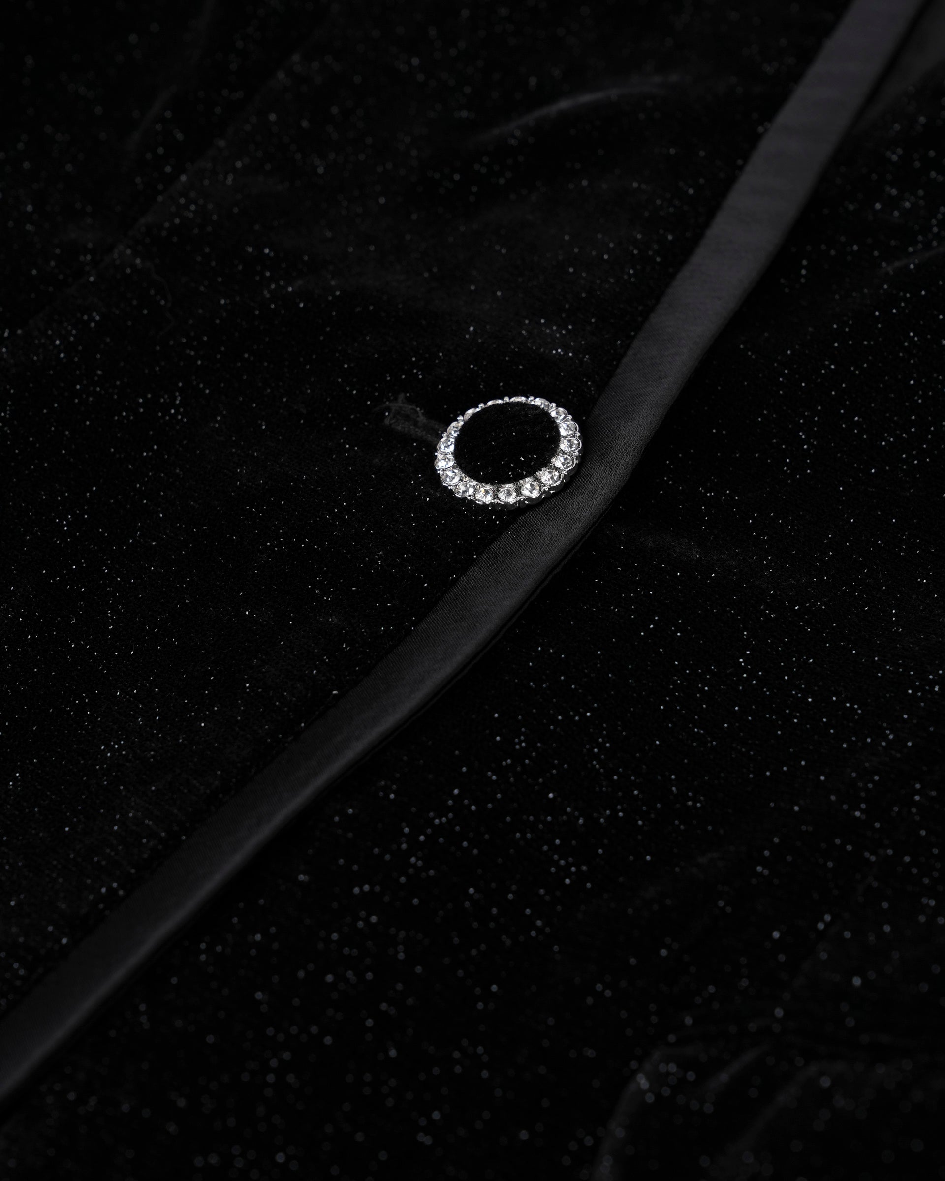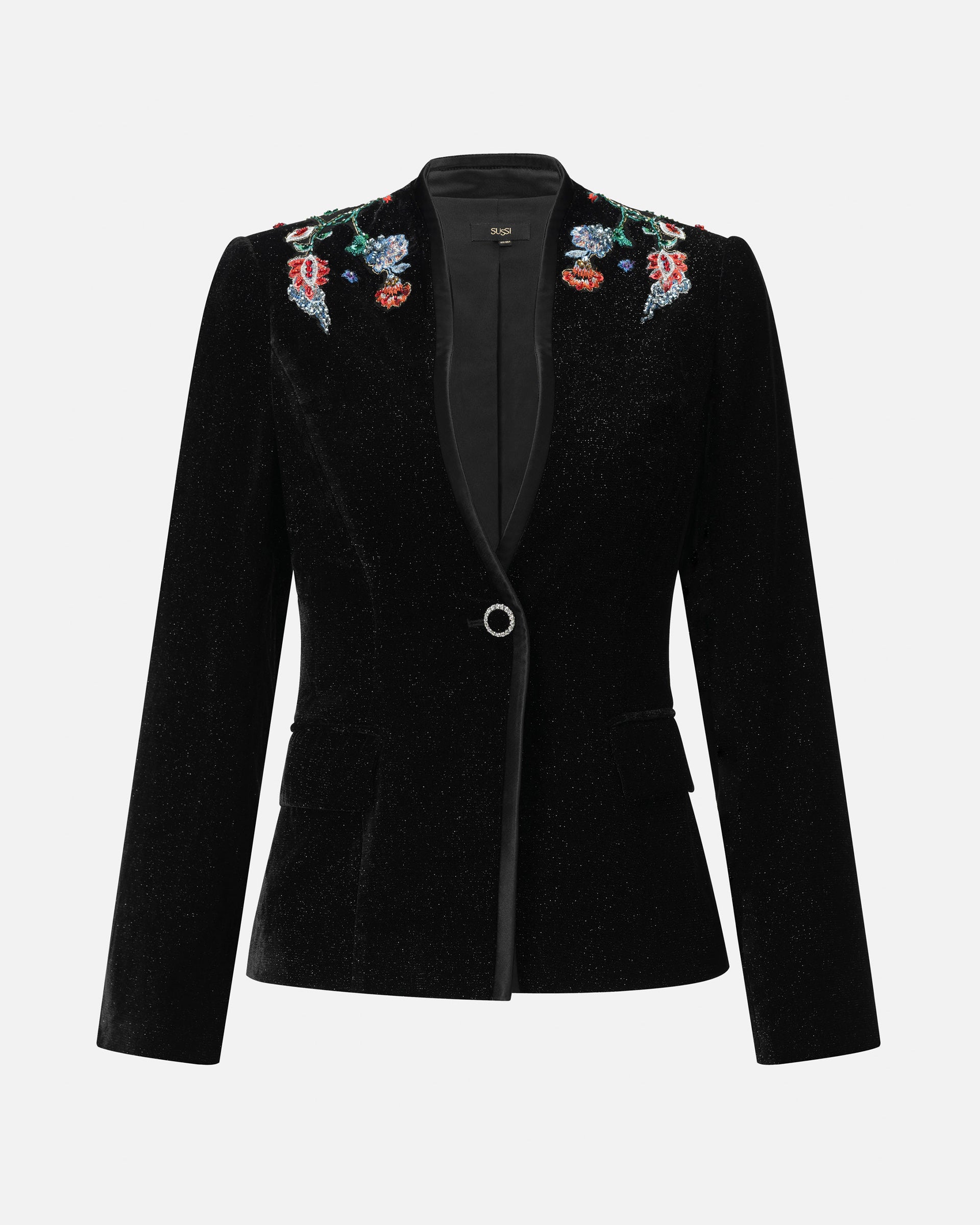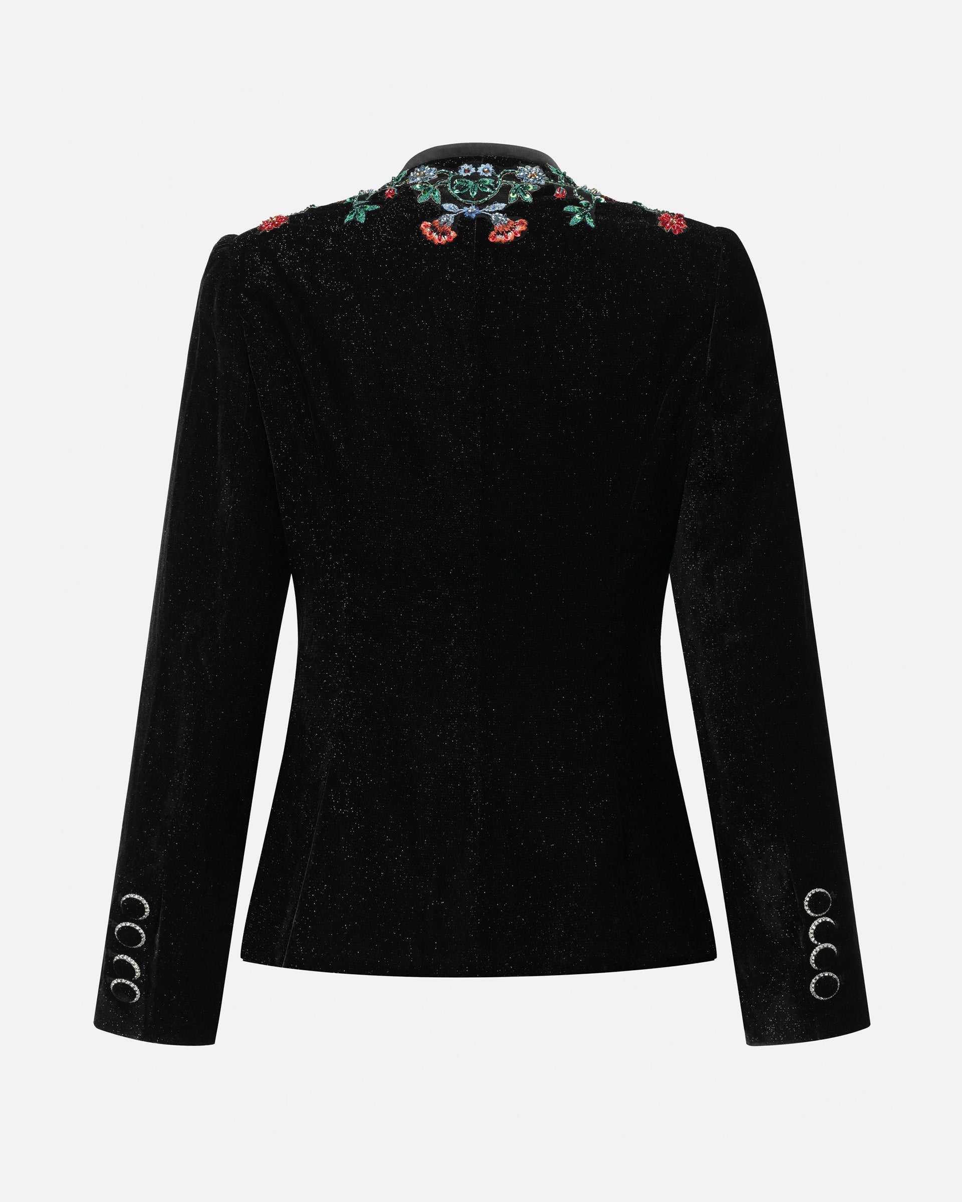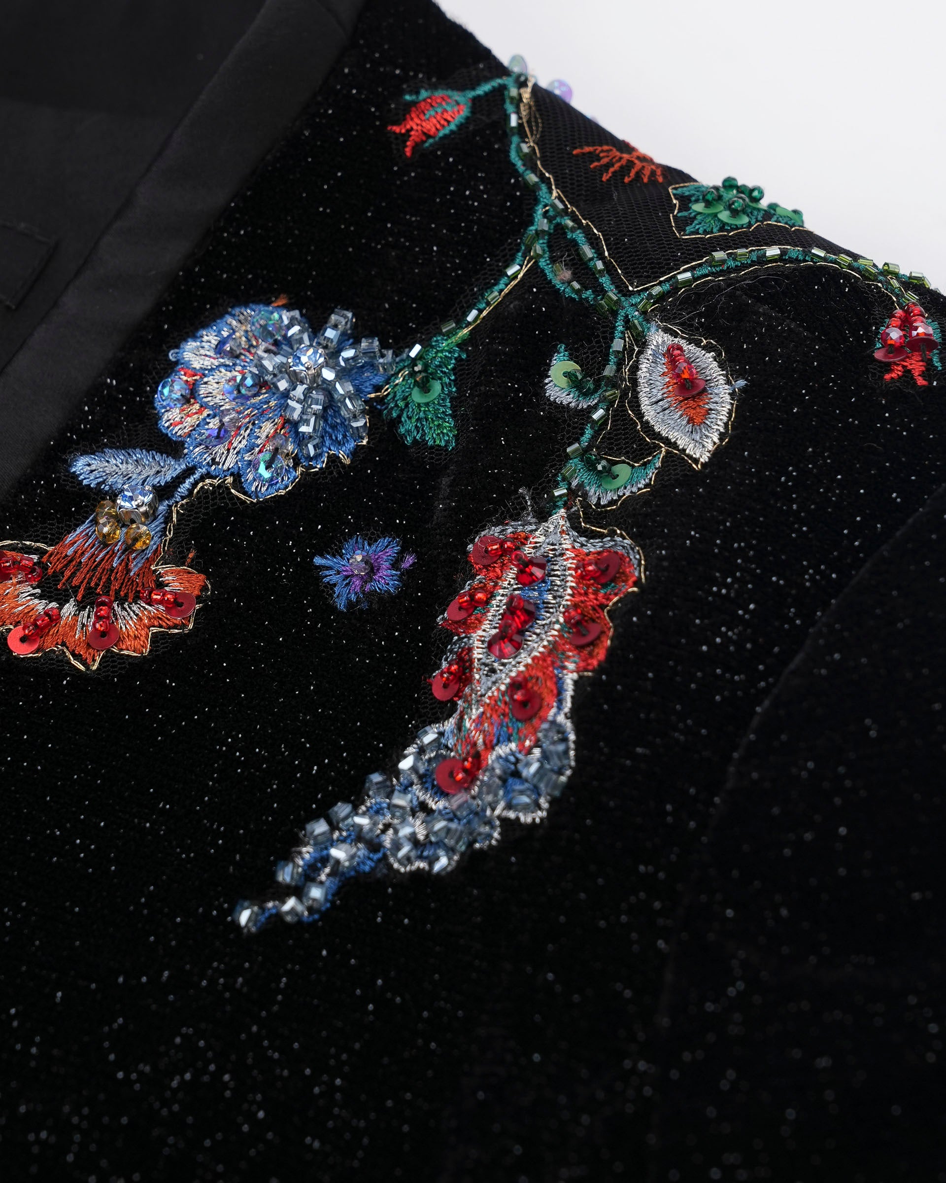This blazer combines rich craftsmanship with a sleek silhouette, showcasing intricate embroidery inspired by Eastern motifs of prosperity and beauty. Its tailored fit and polished details make it perfect for business or elegant occasions.