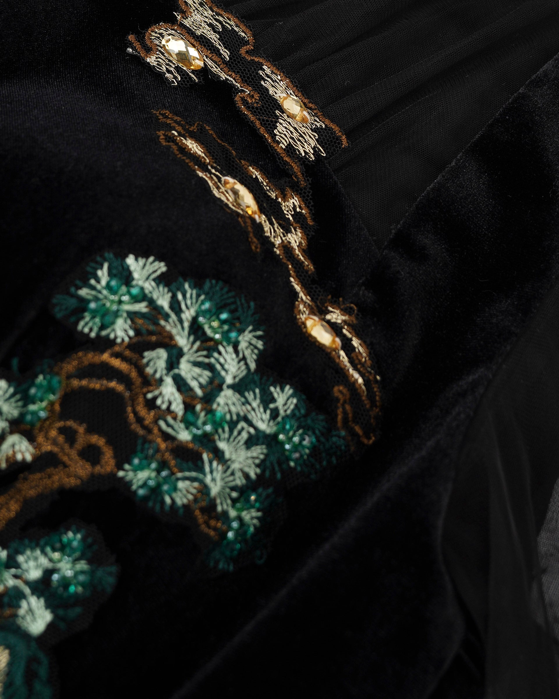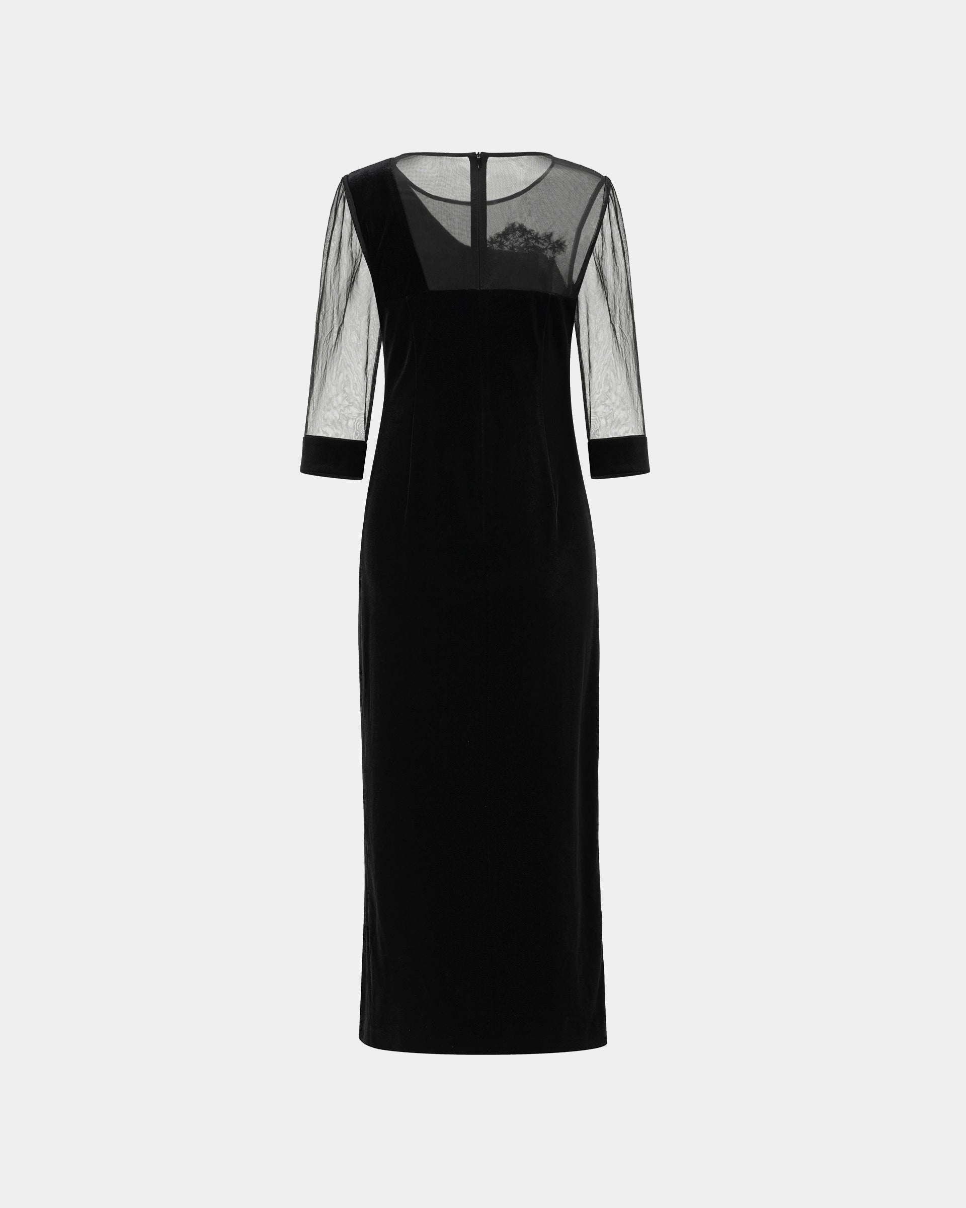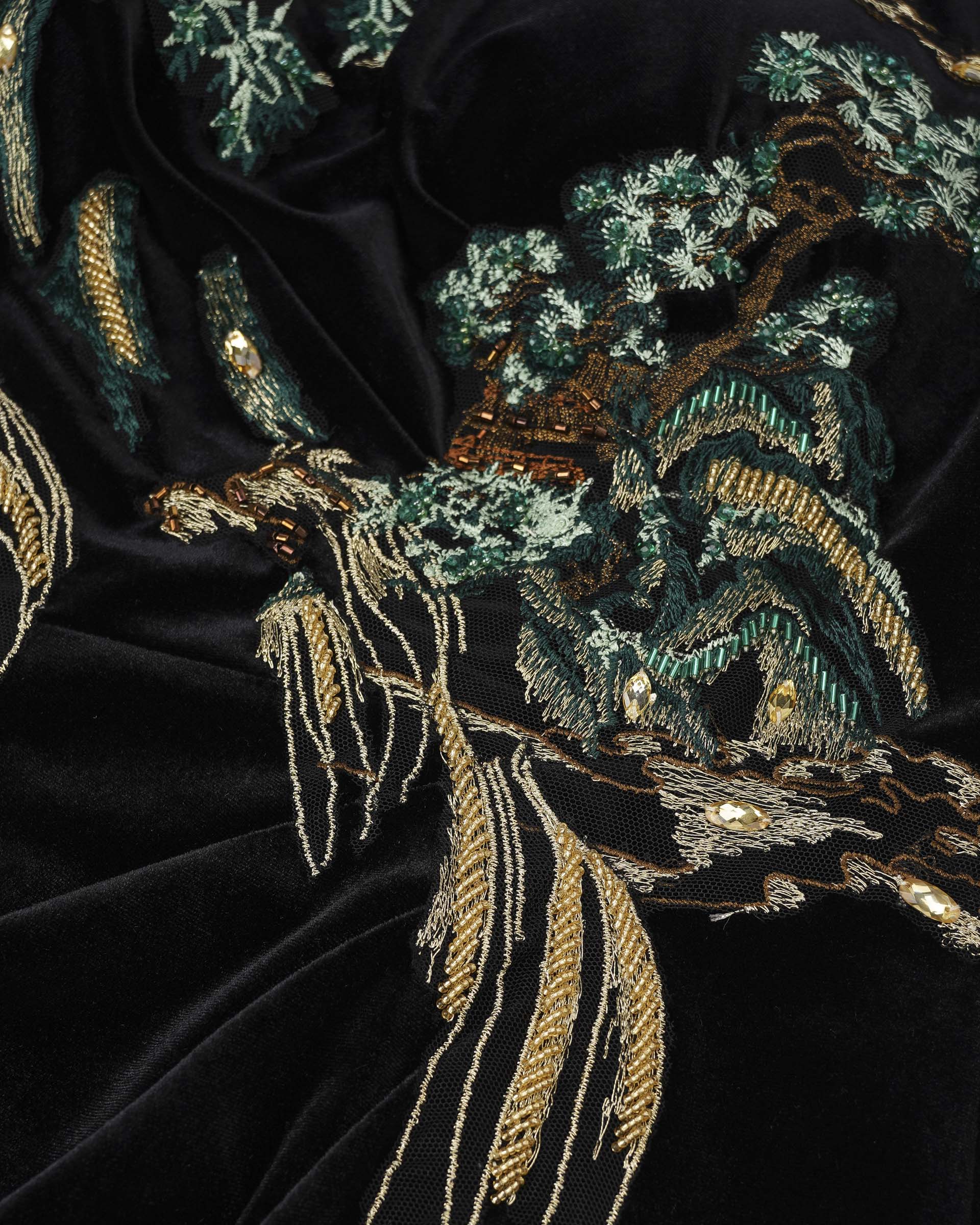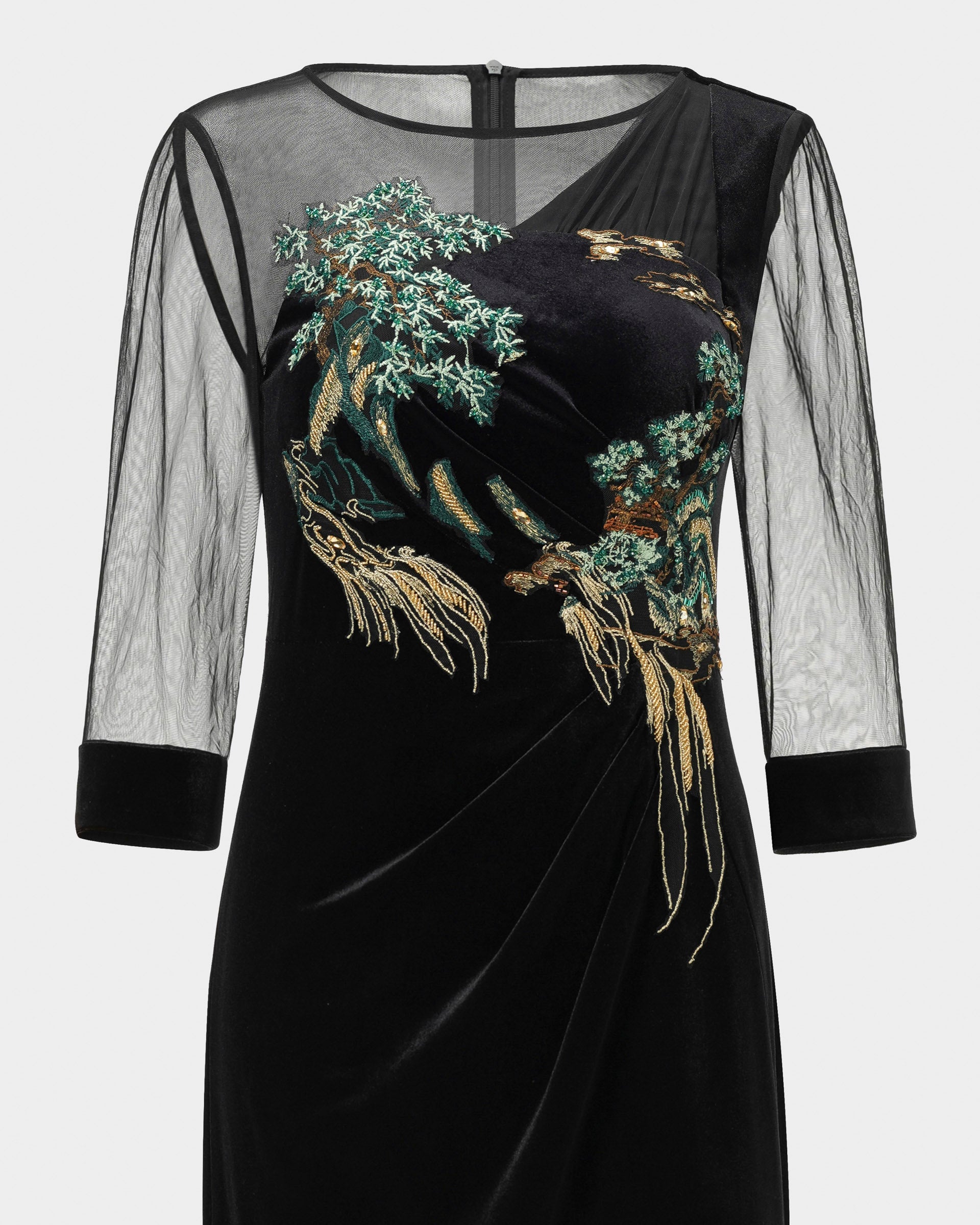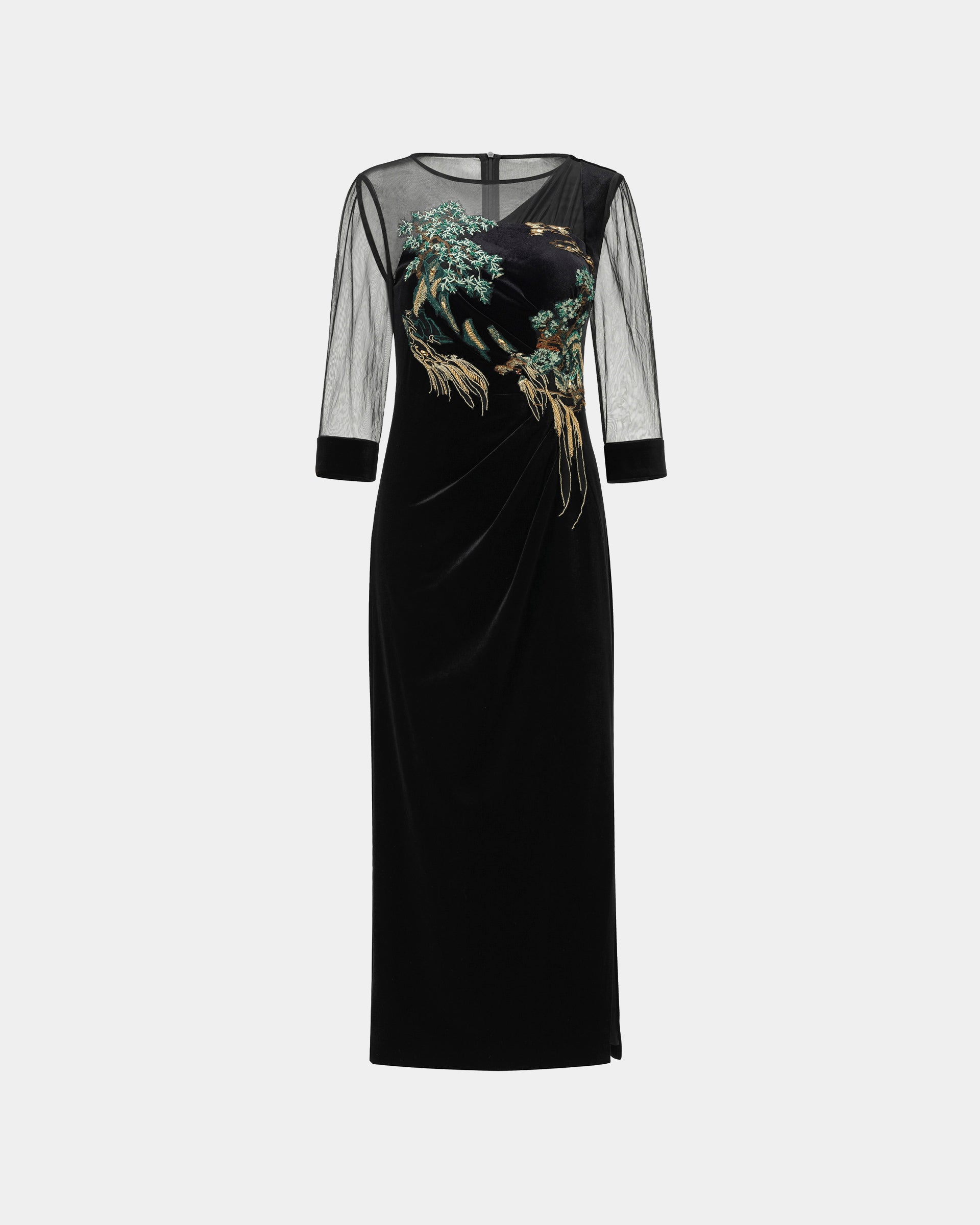 This embroidered midi dress captures the vitality of nature with intricate embroidery inspired by rivers and forests. Its fitted silhouette and sheer sleeves exude elegance and modern charm, ideal for formal gatherings.
