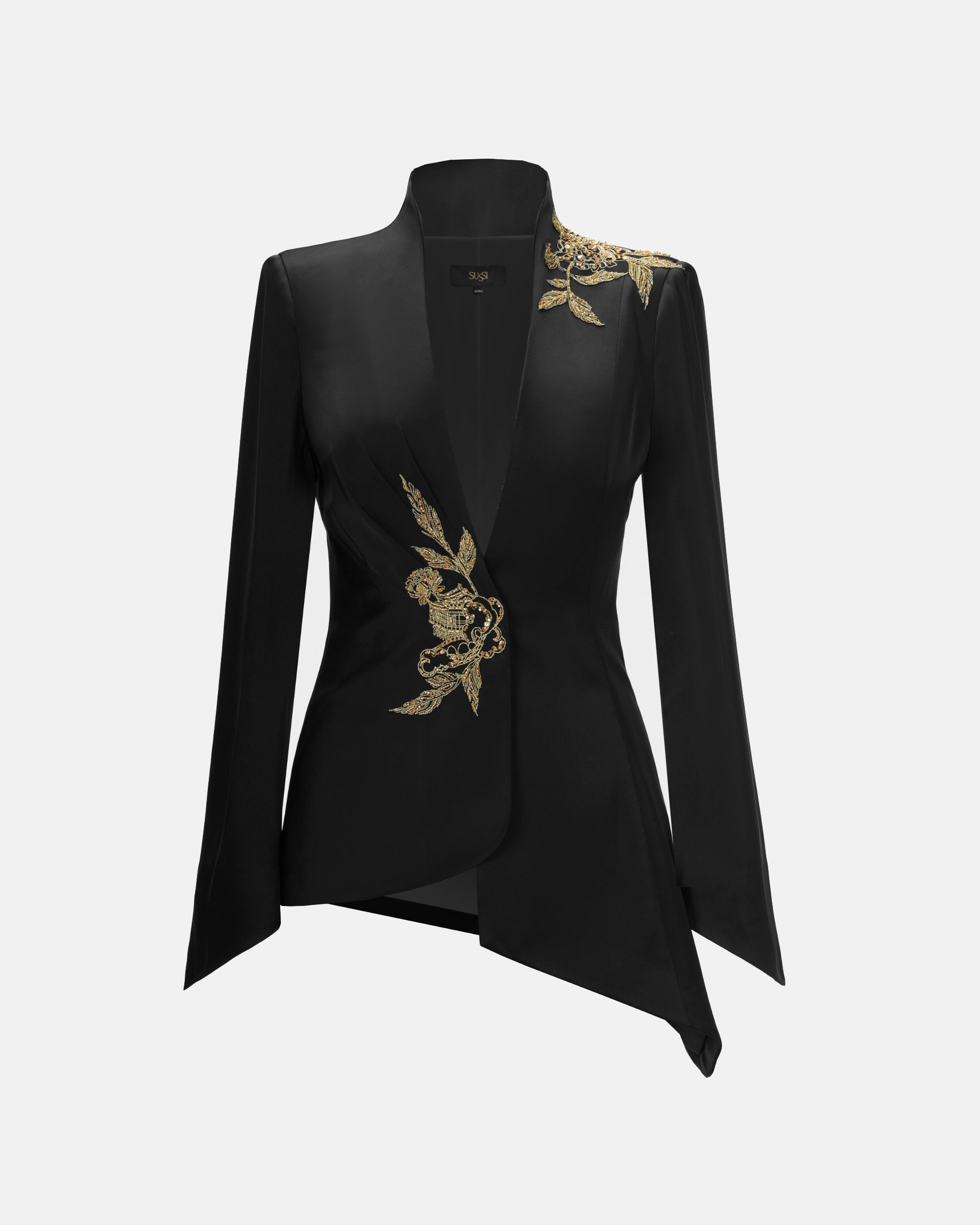 Un blazer noir sur mesure orné d'une broderie complexe de phénix,