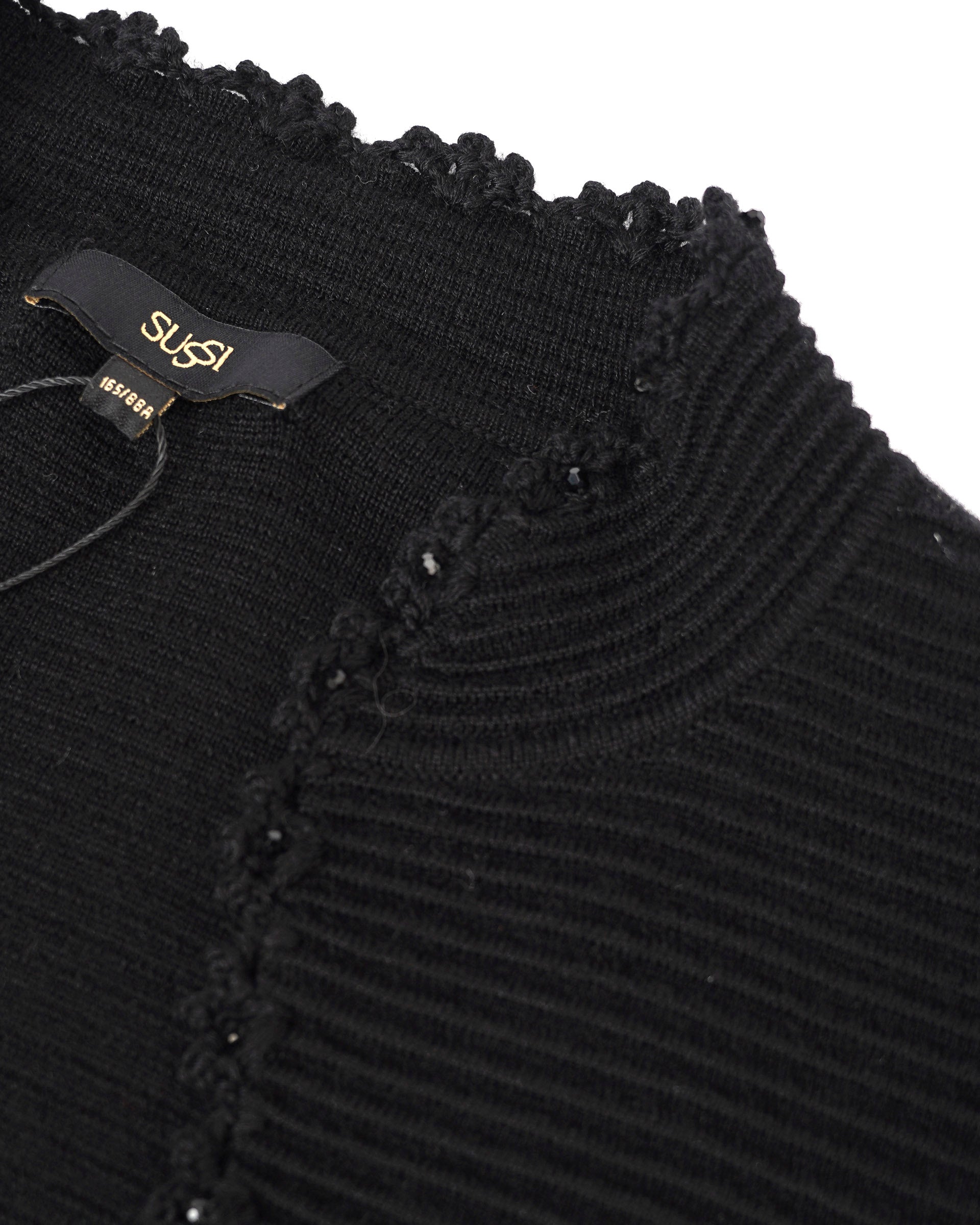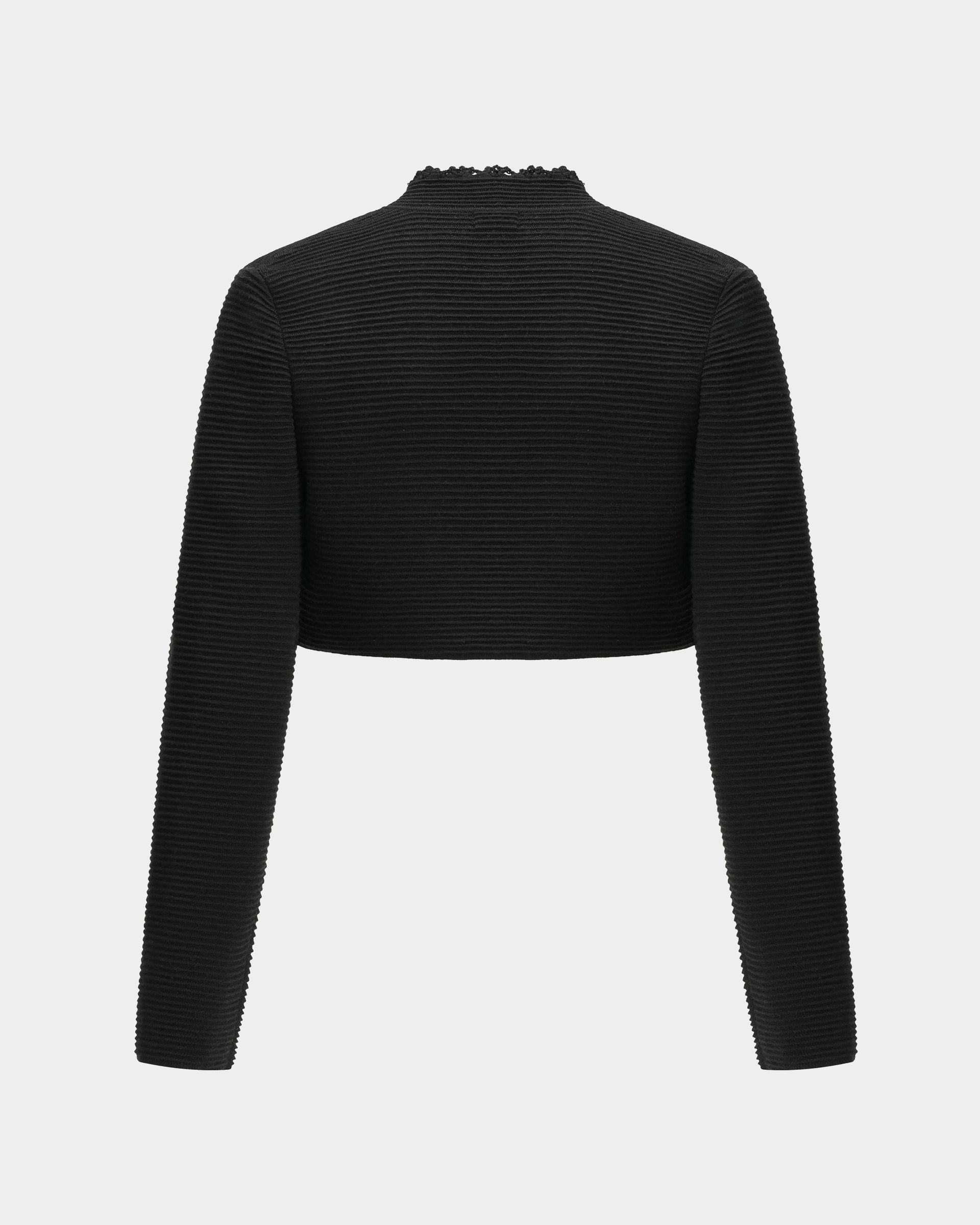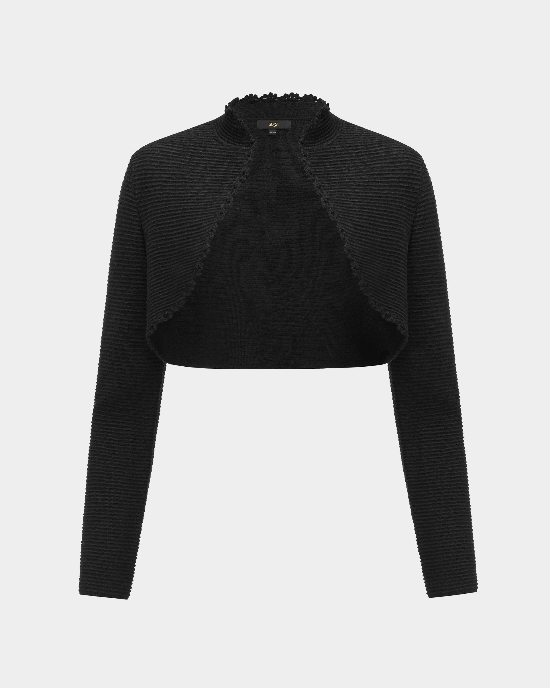 Ce boléro en tricot noir allie des fils doux à des motifs complexes pour un mélange de confort et d'élégance. Conçu pour être polyvalent, il accentue l'encolure et offre une option de superposition raffinée pour diverses tenues.