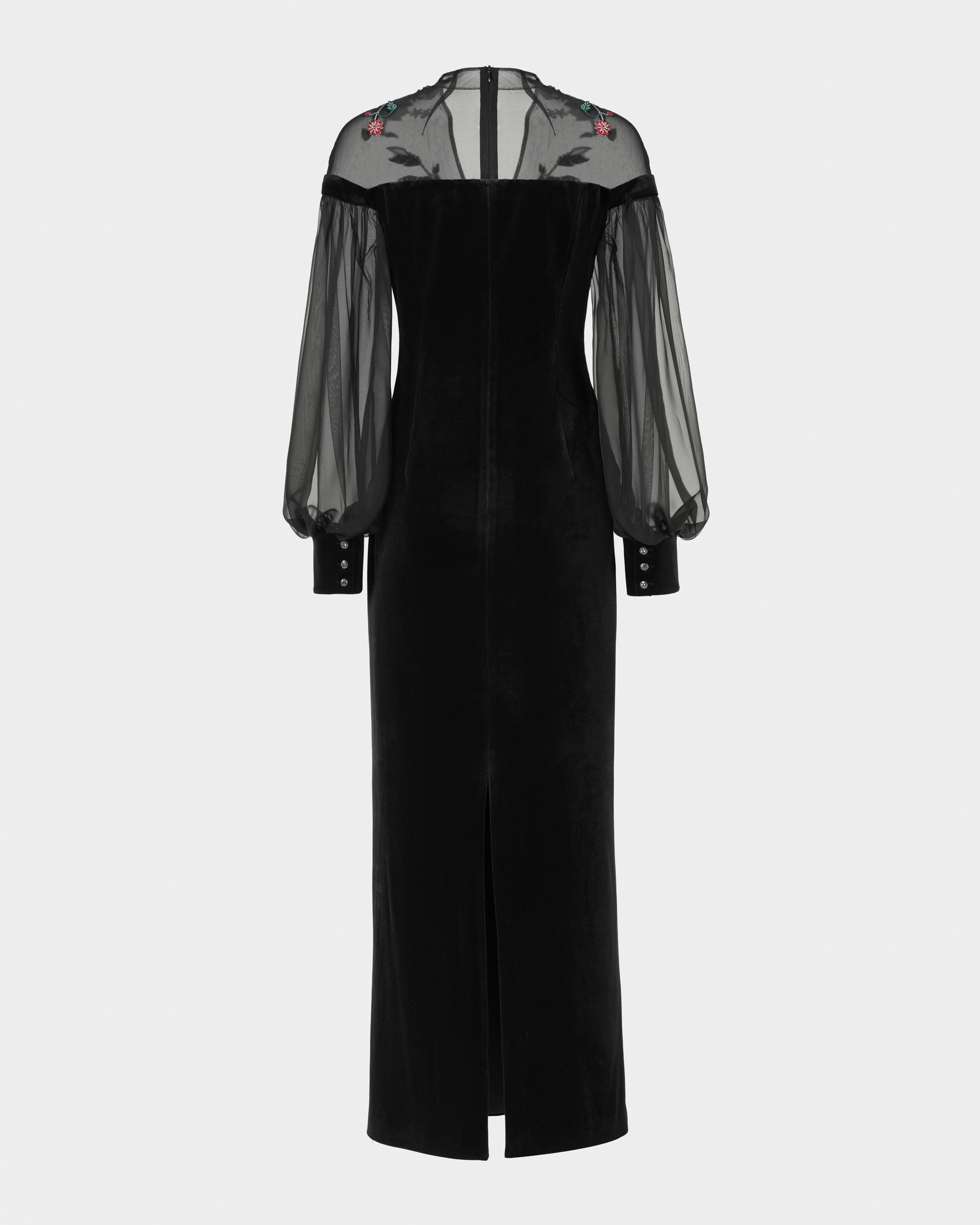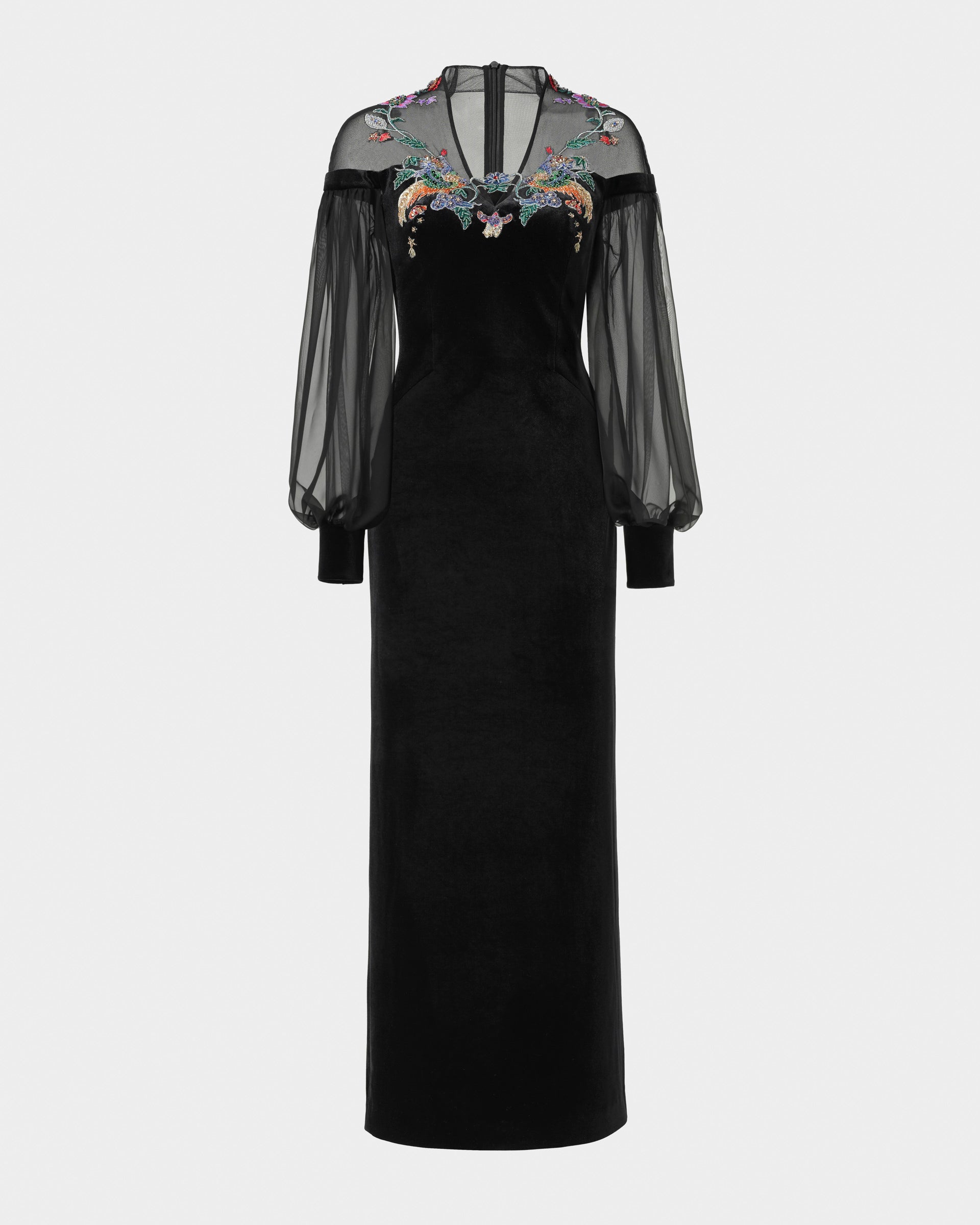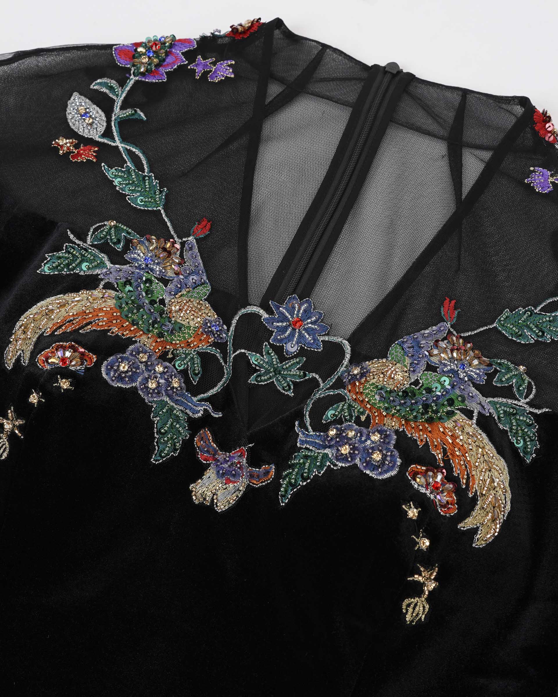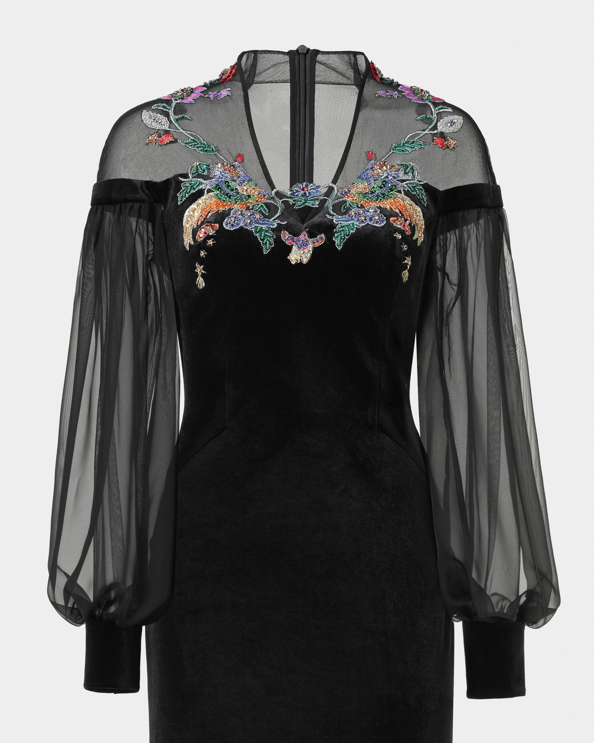 Robe fourreau brodée Phoenix avec manches lanternes