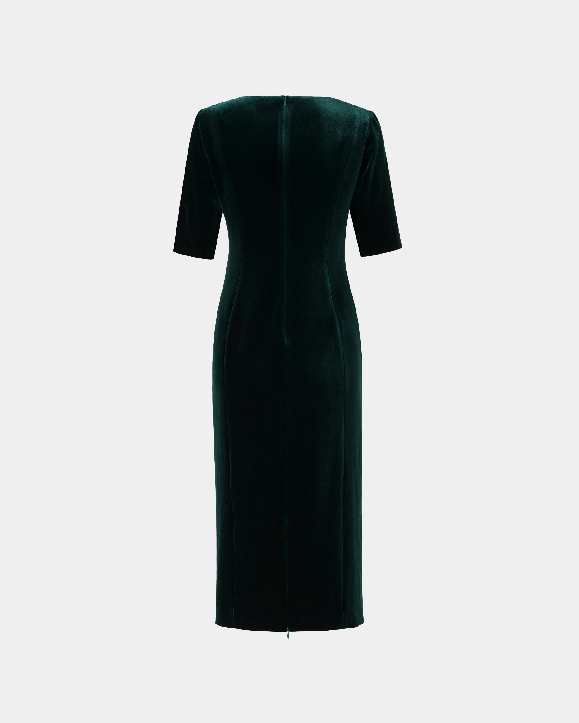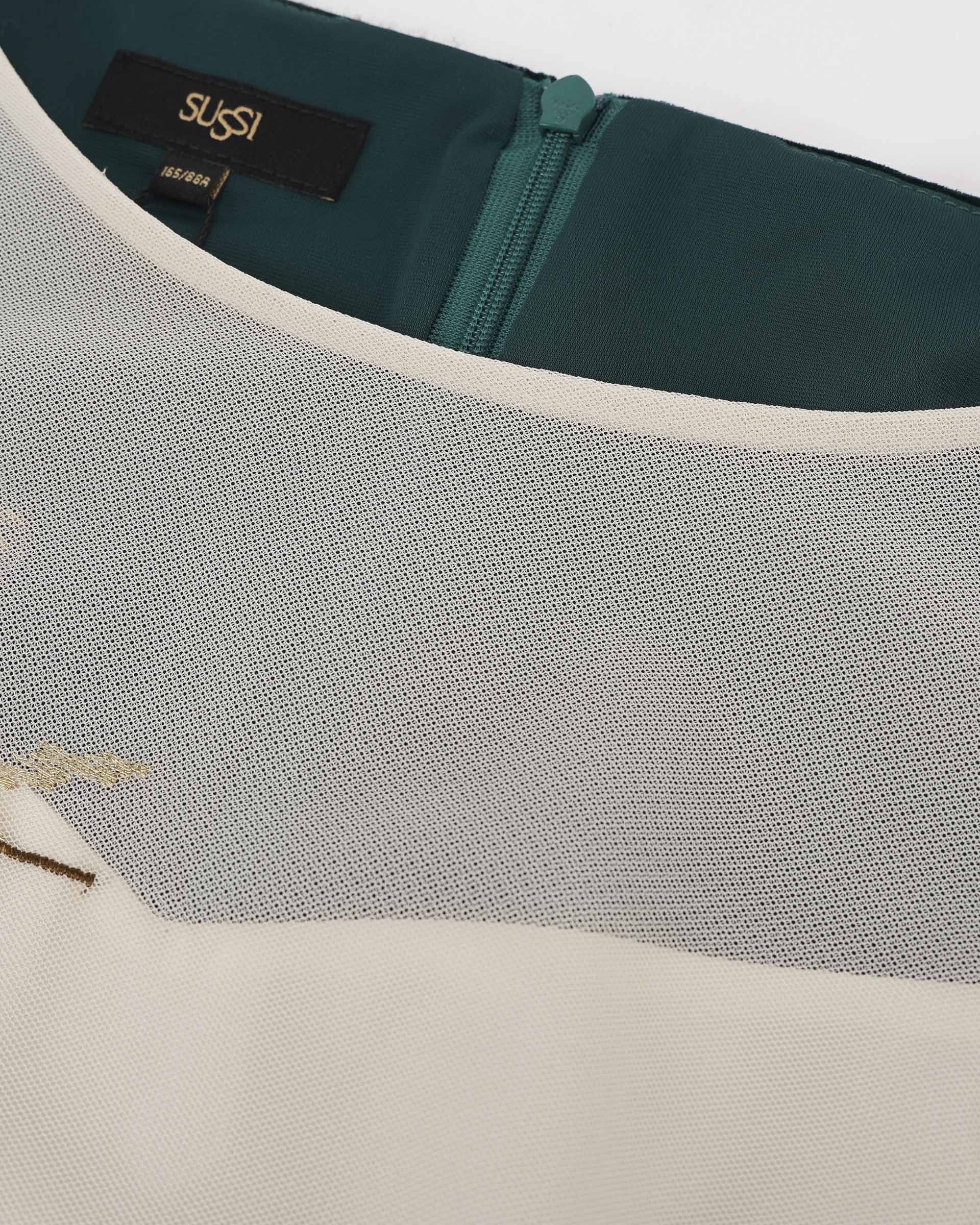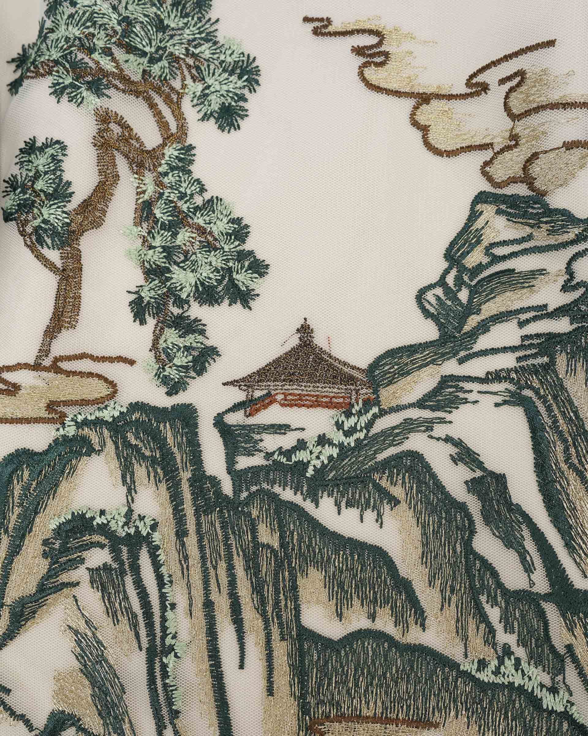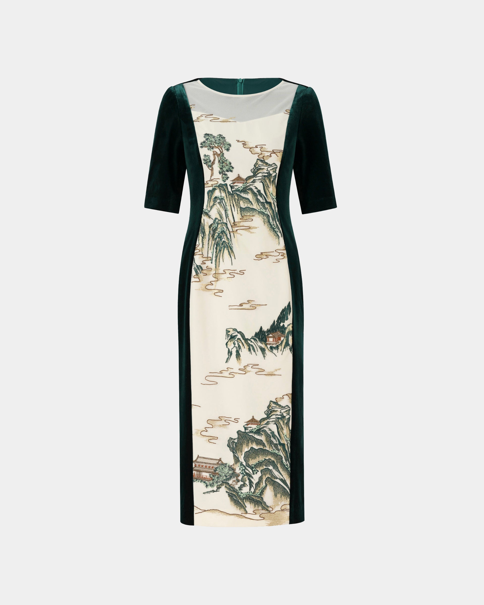 Cette robe fourreau est ornée d'une broderie exquise inspirée des rivières sereines et des forêts luxuriantes, capturant la vitalité de la nature. Avec un décolleté structuré d'inspiration vintage et une silhouette ajustée flatteuse, cette robe allie harmonieusement élégance intemporelle et design moderne.