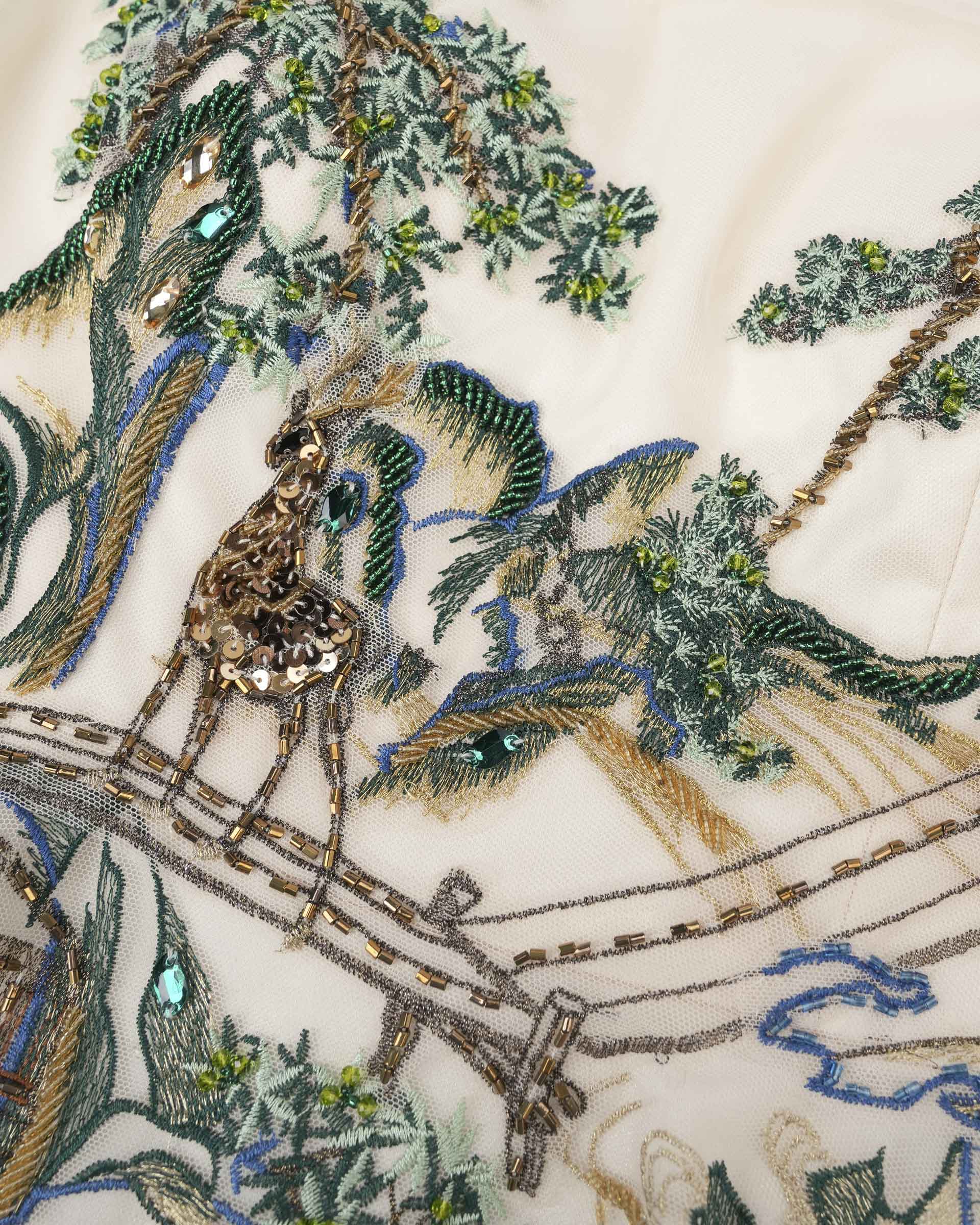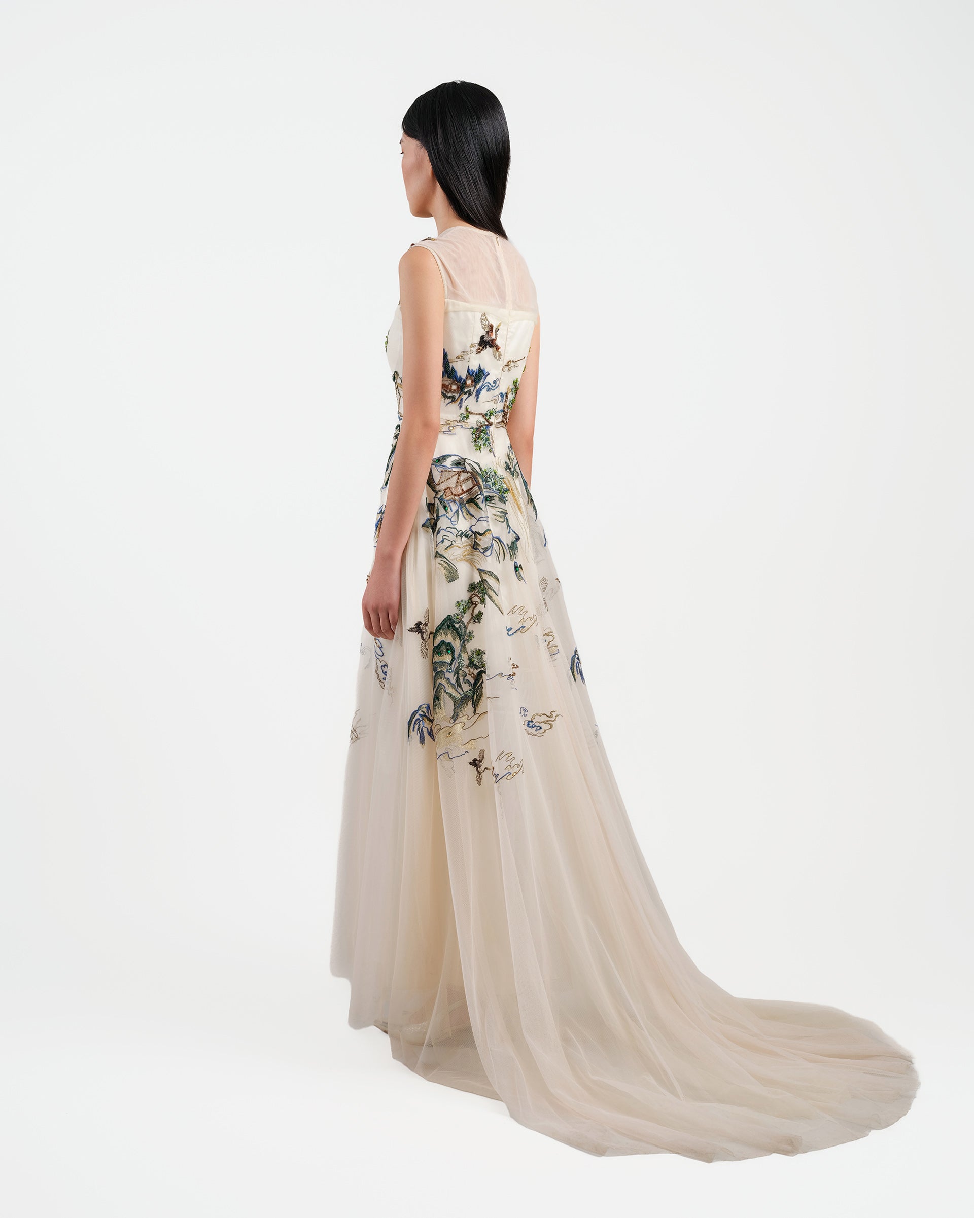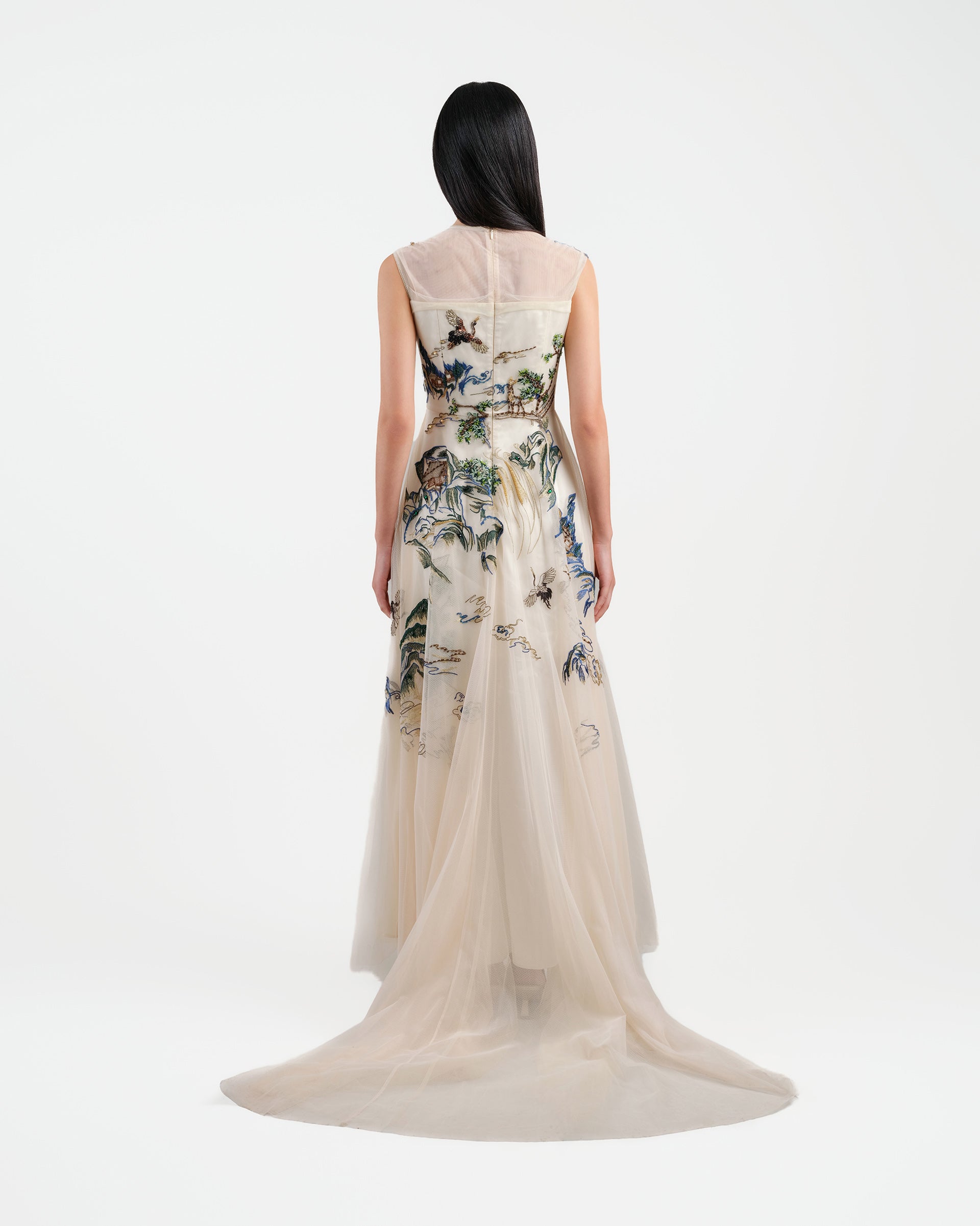 Inspirée des rivières fluides et des paysages luxuriants de l'art chinois, cette robe est ornée de broderies complexes qui donnent vie à la beauté de la nature. Avec un décolleté royal et un élégant ourlet haut-bas, ce modèle allie sophistication culturelle et grâce contemporaine.